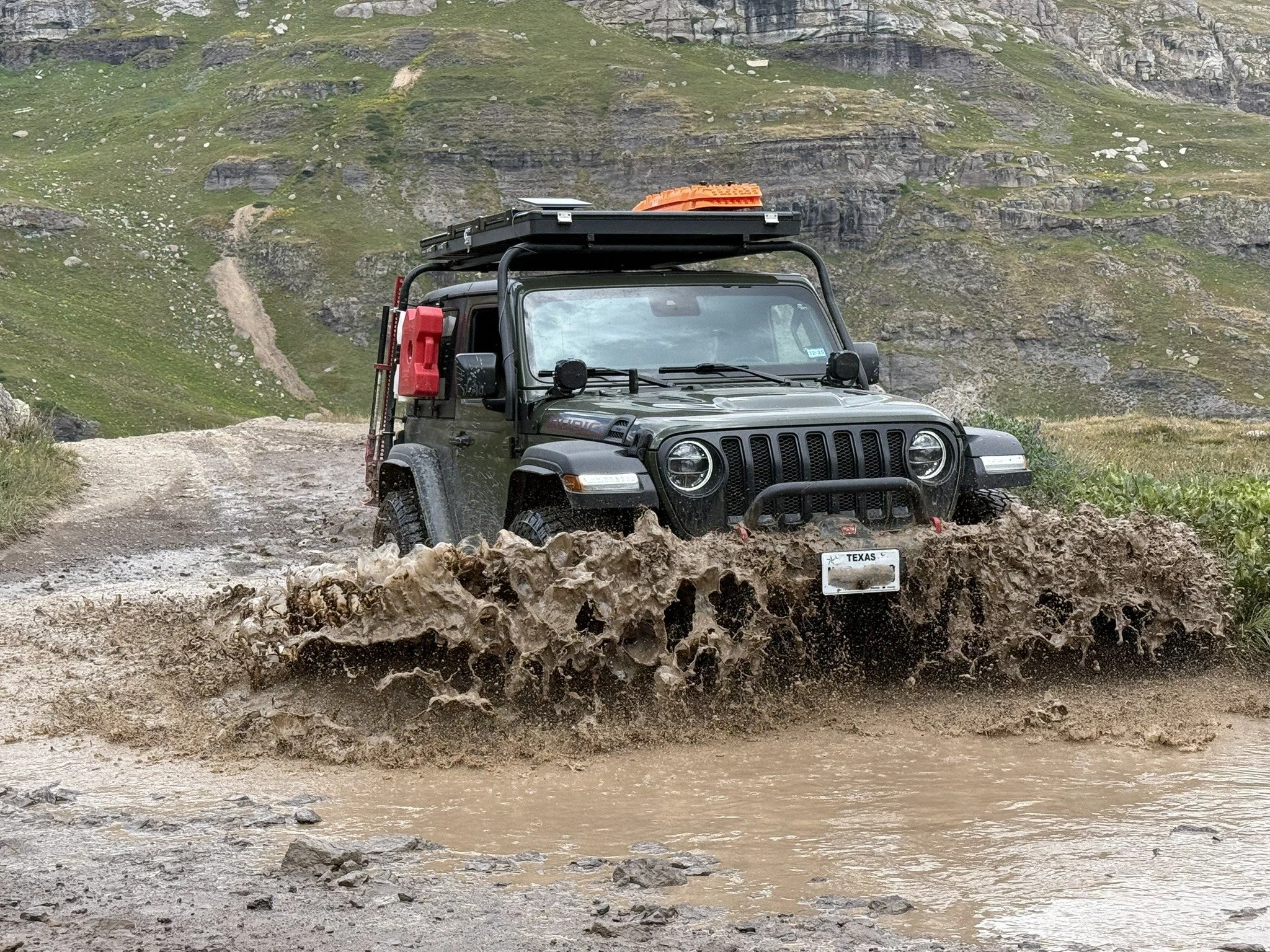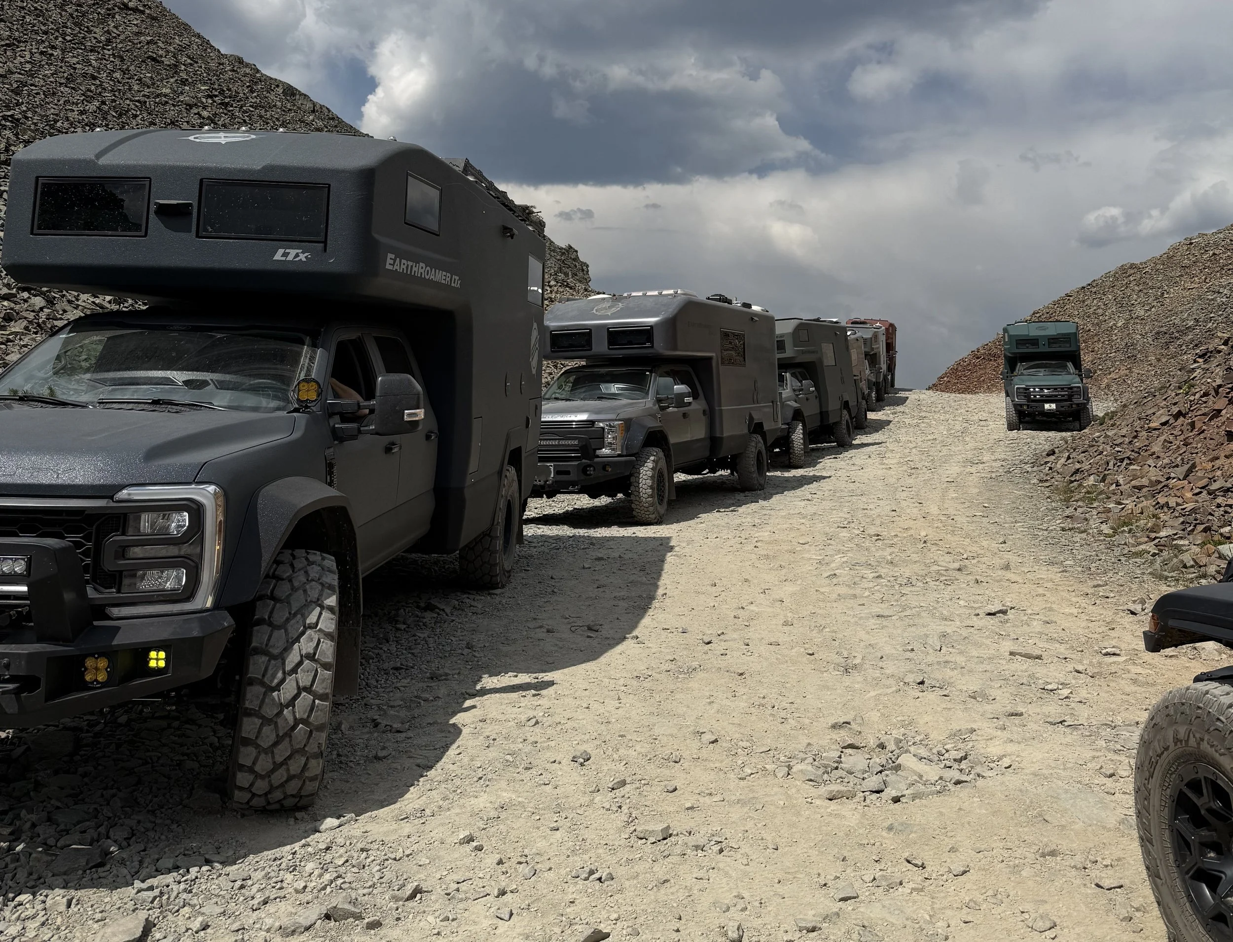 Not long into the climb, I encountered a group of EarthRoamers. If you’ve never seen one in person, they’re massive—off-road RVs that feel more expedition than recreation. Seeing them gathered on a hillside felt like stumbling across Hannibal’s elephants mid-campaign. They had pulled over to regroup where the trail widened just enough to allow passing. EarthRoamer owners take pride in their rigs, each one numbered in bold on the exterior. The first question I got: “What’s your friend’s number?”